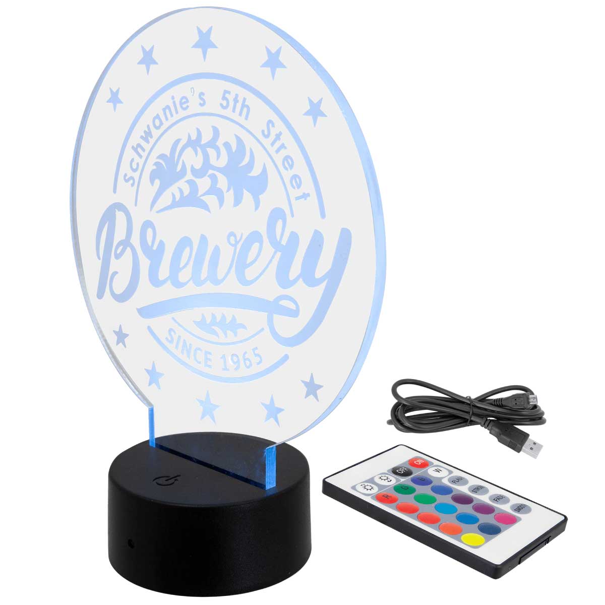 Light up your favorite player with a LED nightlight offering 16 different color choices. This lighted base comes with a remote that allows you to change colors, flash, strobe, fade and adjust the brightness of the light. Add your players name and favorite number to the image.